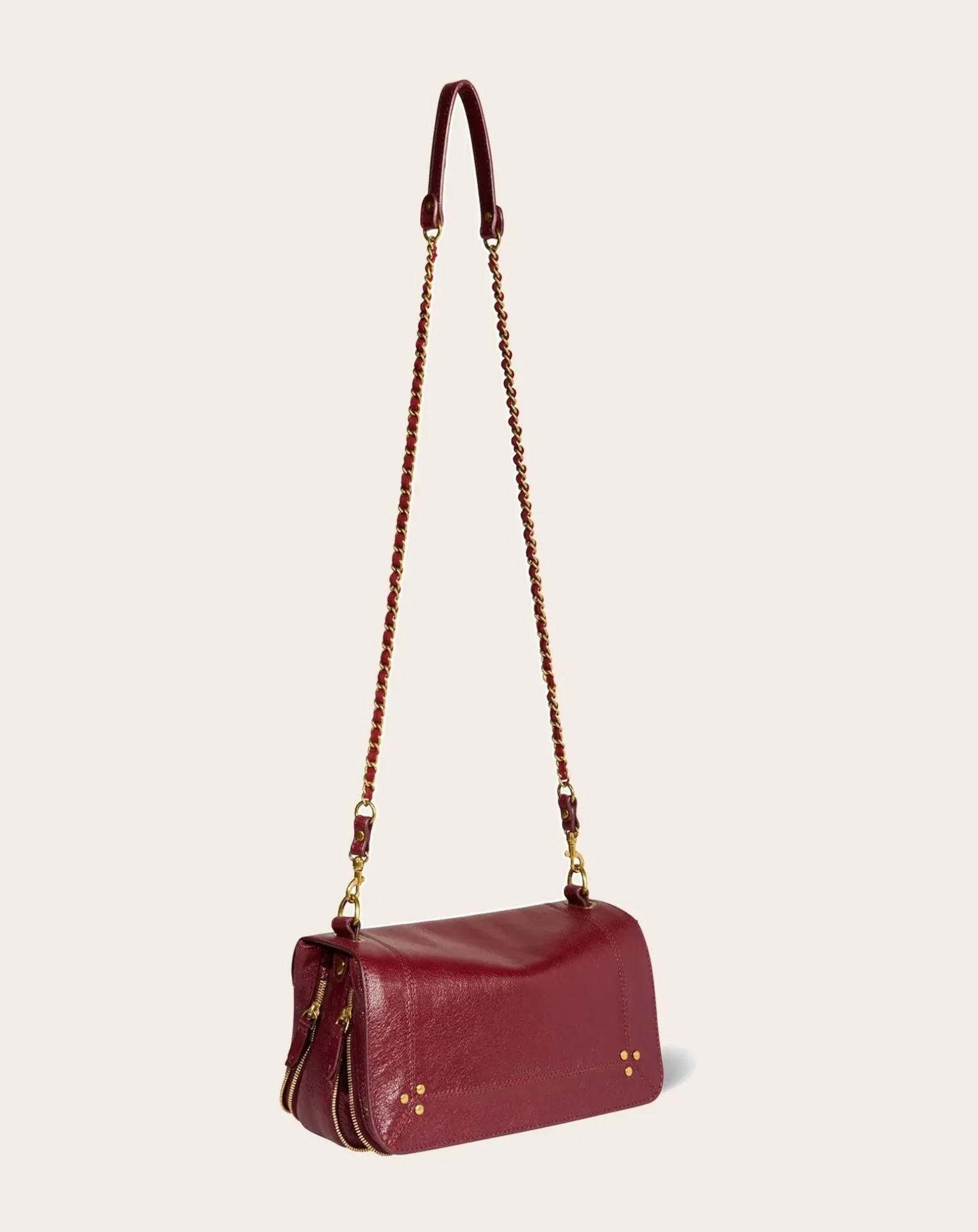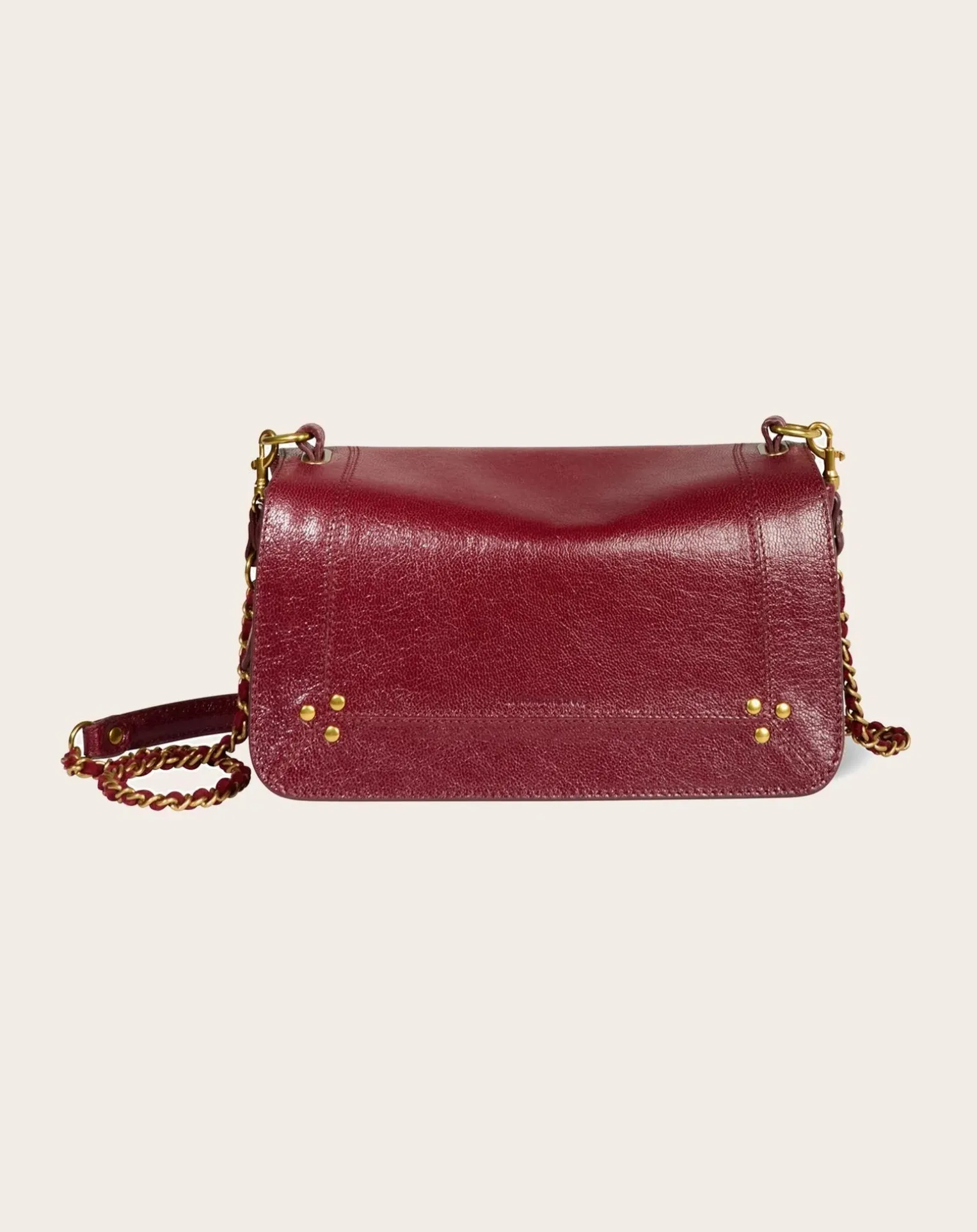 - Sac bandoulière, porté à l’épaule ou en croisé. Bandoulière amovible en chaine tressée de cuir réglable en deux longueurs. Fermeture par un rabat en cuir aimanté.