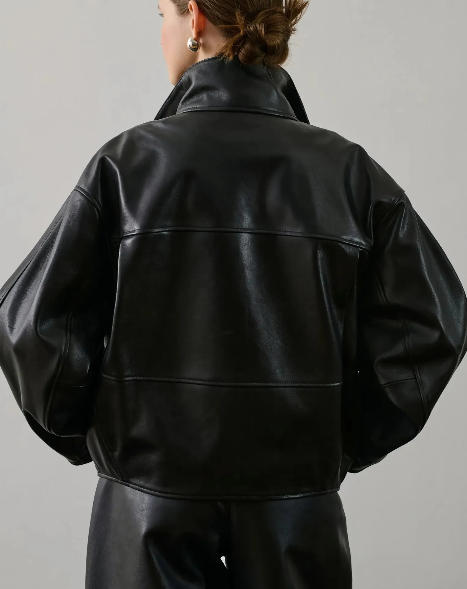 - Veste en cuir,Forme volontairement très ronde et oversize ,Manches longues,Col montant,Fermeture zip,Deux poches devant