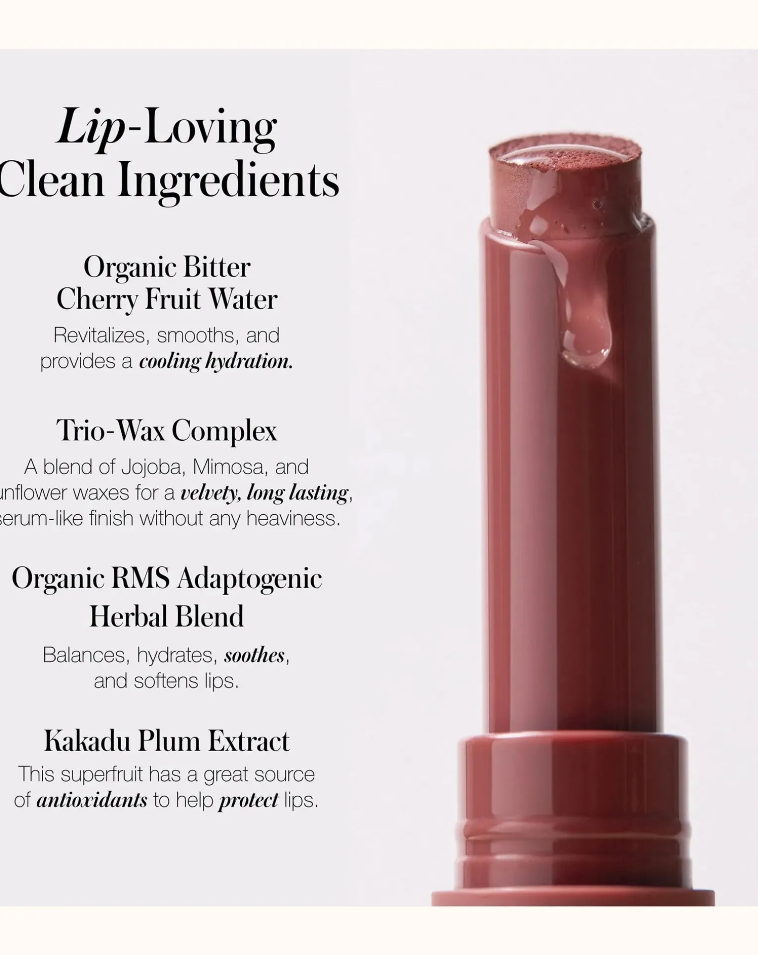 - Une toute nouvelle façon d’apporter une couleur et une hydratation longue durée aux lèvres, ces rouges à lèvres innovants apportent de riches nutriments et une couleur éclatante avec une surprenante sensation de fraîcheur à l’application. Super légère mais pigmentée, la formule à base d’eau non desséchante hydrate et revitalise les lèvres avec un minimum d’effort, un impact durable et une sensation d’apesanteur. La majorité de l’eau contenue dans la formule a été remplacée par de l’eau de fruit de cerise amère biologique qui lisse et hydrate les lèvres. Le mélange de plantes adaptogènes RMS équilibre et l’extrait de prune de Kakadu protège, tandis que le complexe Trio-Wax offre un fini longue durée semblable à un sérum.