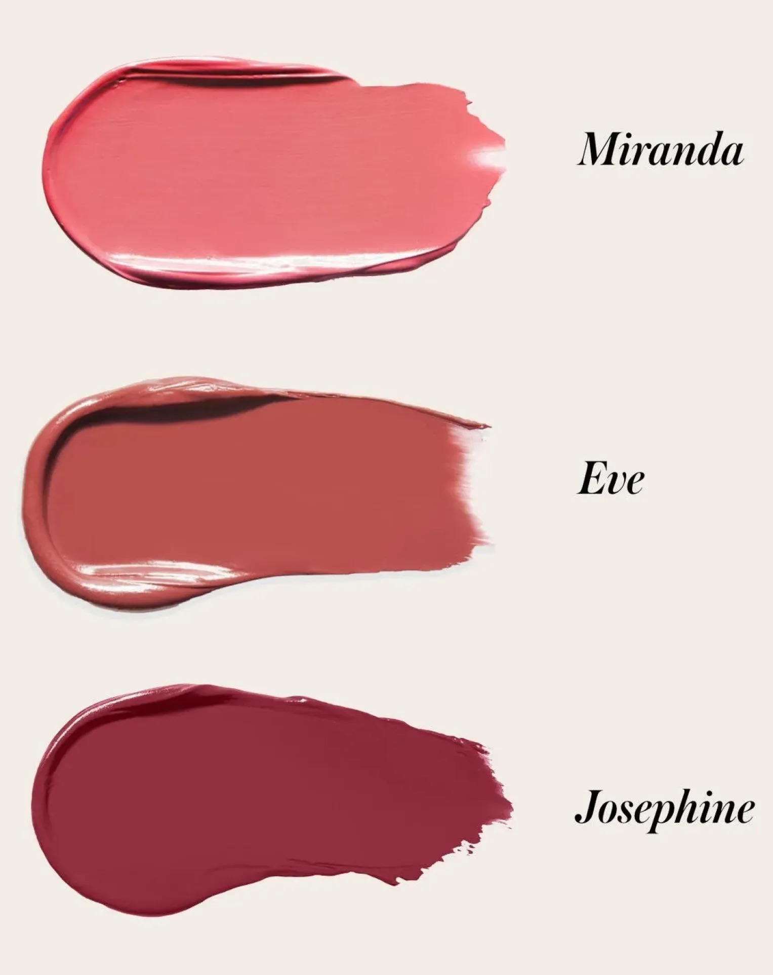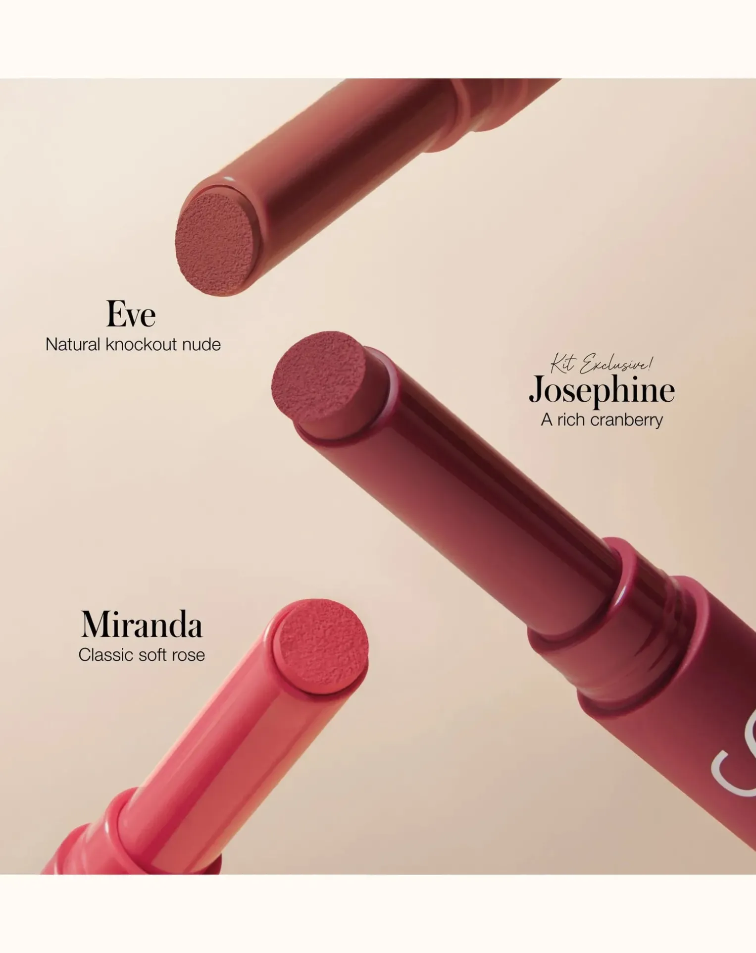 - Trois teintes de rouge à lèvres légendaire en taille réelle : Miranda, un rose doux classique ; Eve, un rouge rosé naturel ; et Joséphine, une nouvelle teinte riche et exclusive de canneberge. Miranda : Rose doux classique ; Eve : Nu naturel à couper le souffle ; Josephine : Une riche couleur canneberge