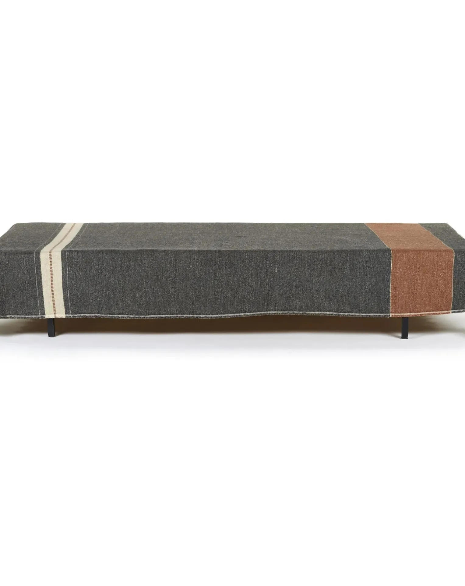 Le plaid Luc présente un joli fond gris, bordé d’une bande cuivre et souligné d’une bande tissée blanc cassé et cuivre. Idéale pour emmener votre nécessaire de toilette ou vos petits trésors partout avec vous.