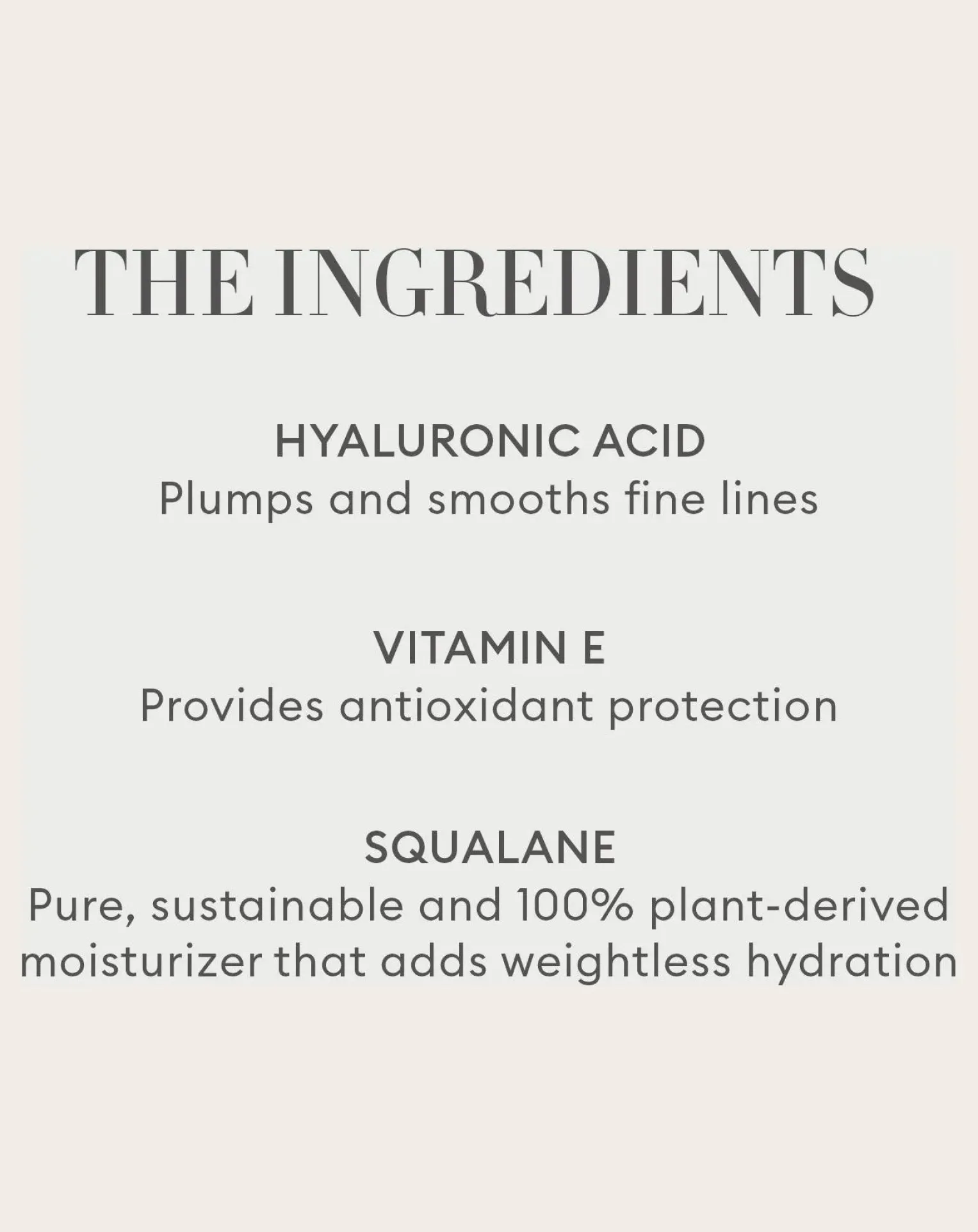 SQUALANE, hydratant pur, durable et 100% dérivé du platine qui apporte une hydratation sans poids ; VITAMINE E, antioxydant puissant qui nourrit et protège la peau ; SODIUM HYALURONATE, lisse les imperfections ; CÉRAMIDES, renforce la barrière protectrice naturelle de la peau.Sans phtalates, Non-comédogène, Sans sulfate, Vegan