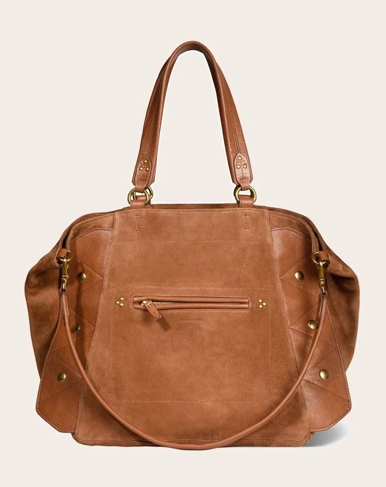- Sac cabas, porté épaule. Deux poignées en cuir et une bandoulière en cuir amovible. Fermeture zippée.