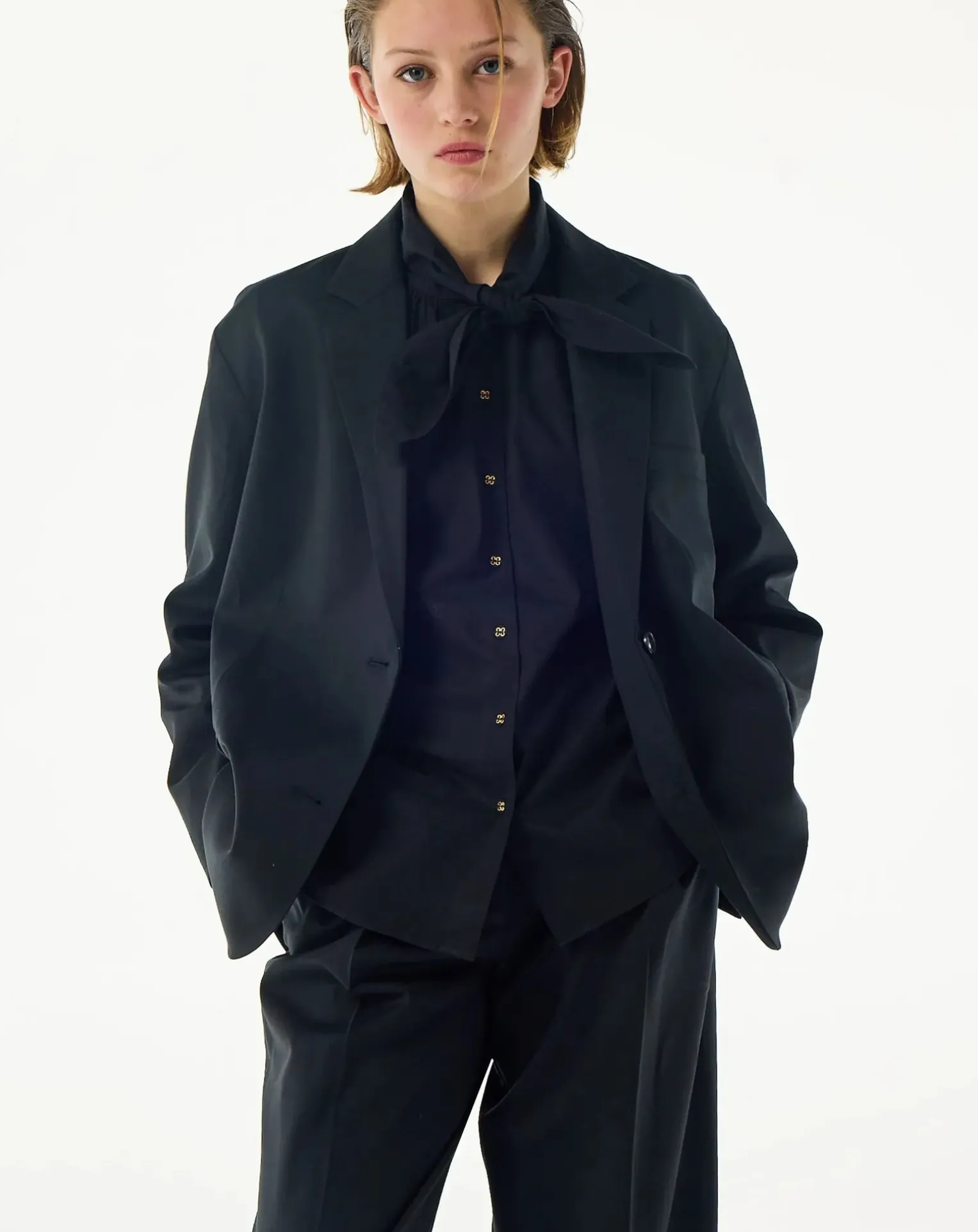 - « – Blouse en popeline uni- Coupe oversize- Manches longues- Col à nouer- Boutonnage tout du long