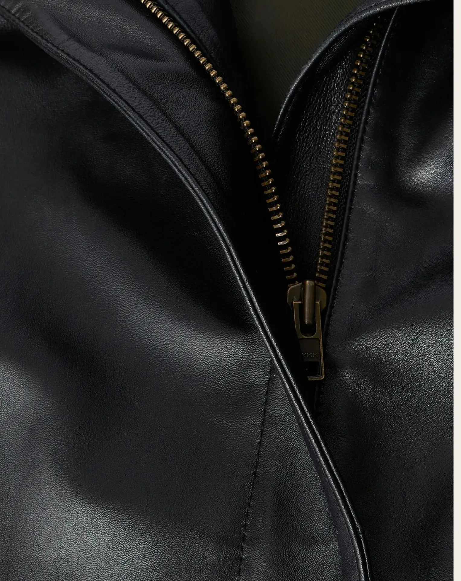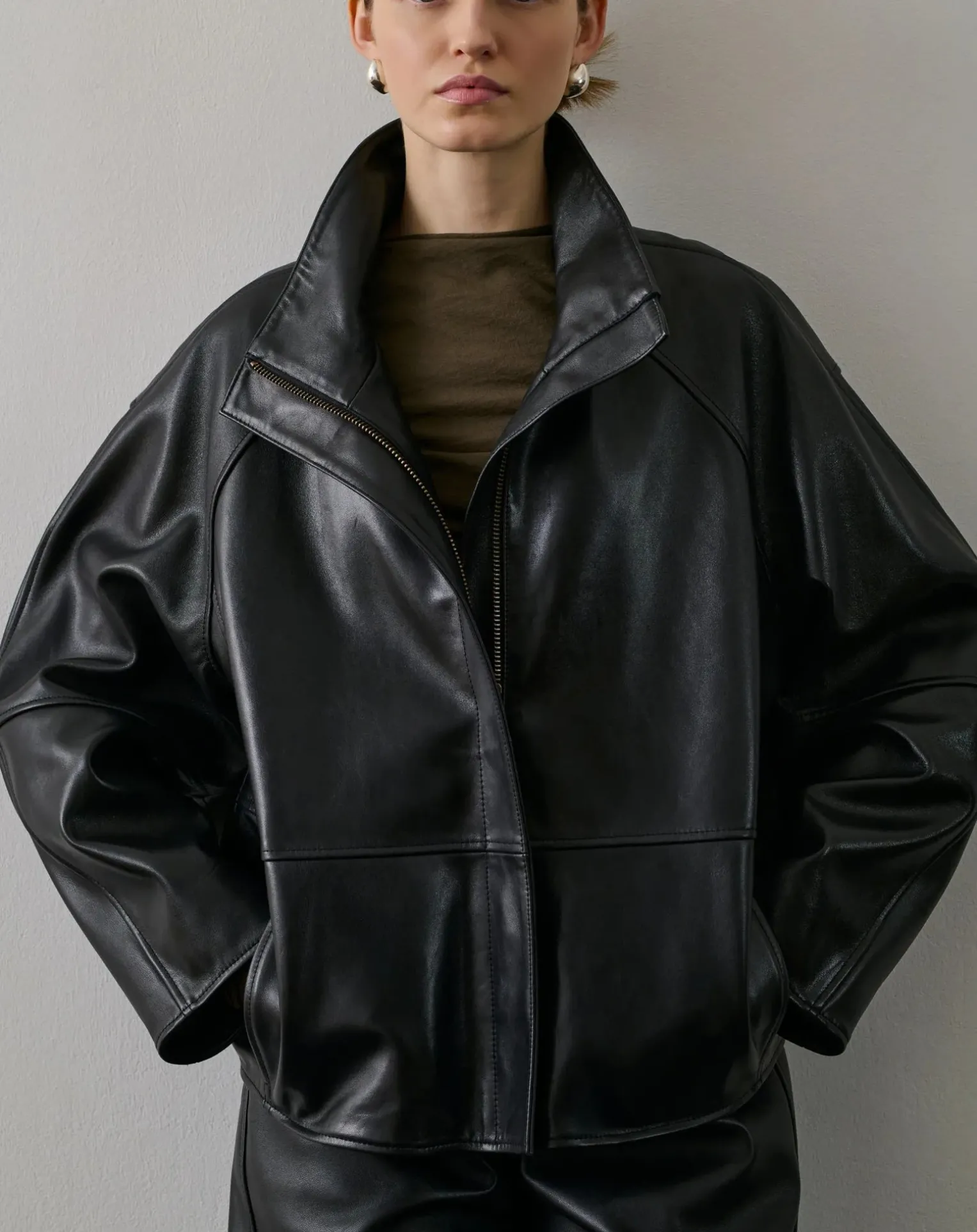 - Veste en cuir,Forme volontairement très ronde et oversize ,Manches longues,Col montant,Fermeture zip,Deux poches devant