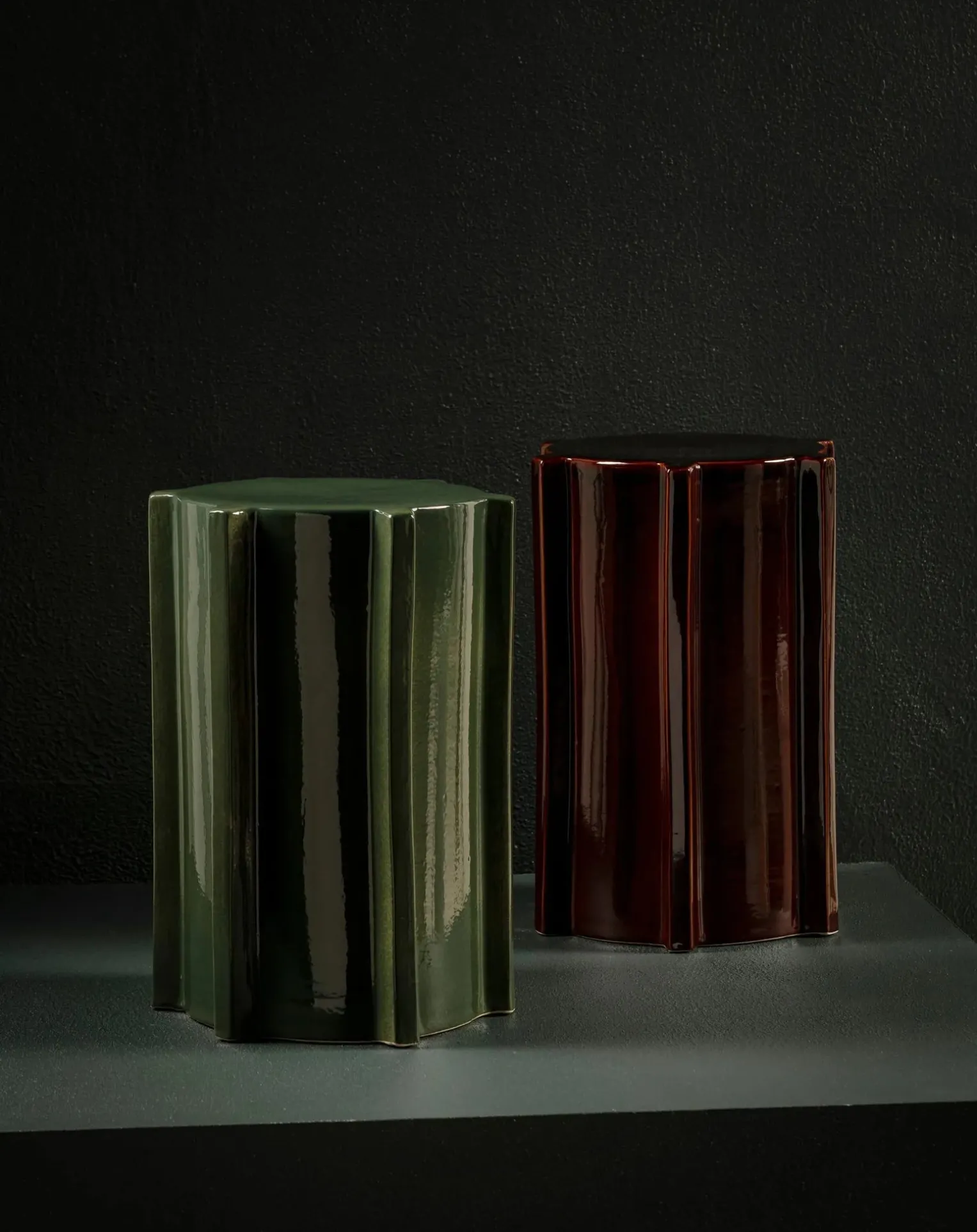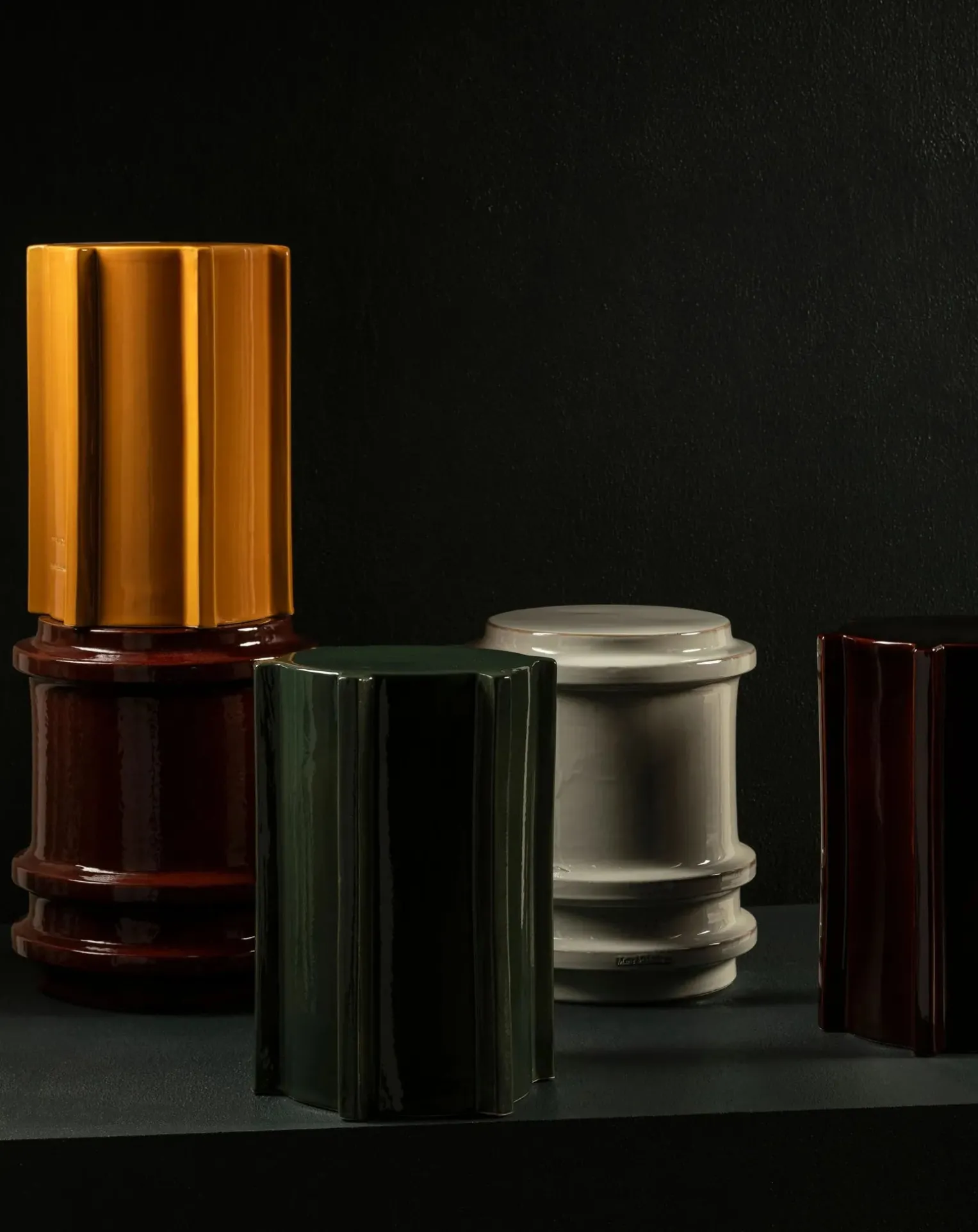 Au fil des ans, les tabourets Pawn sont devenus des objets polyvalents déclinés dans des formes géométriques colorées et des matériaux variés. Depuis peu, la préférence de Marie s’oriente vers le grès émaillé, avec des couleurs riches et profondes en guise de touche finale. L’ajout de rainures horizontales ou verticales rend ces Pawn esthétiquement intéressants tout en offrant une prise pour déplacer facilement les tabourets.
