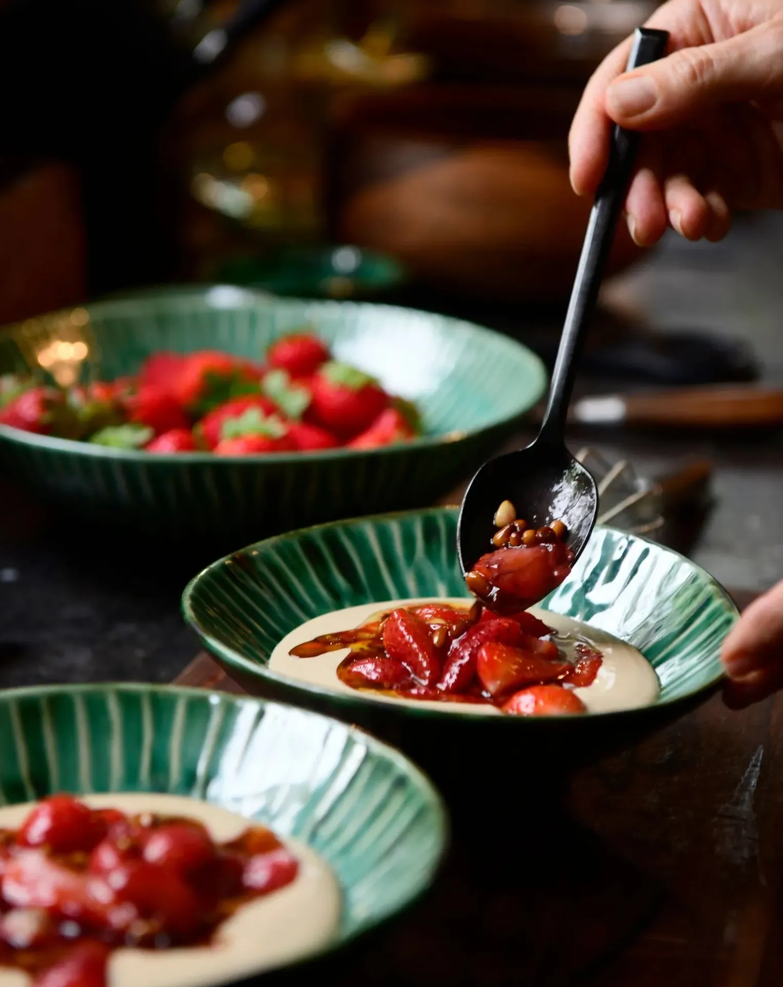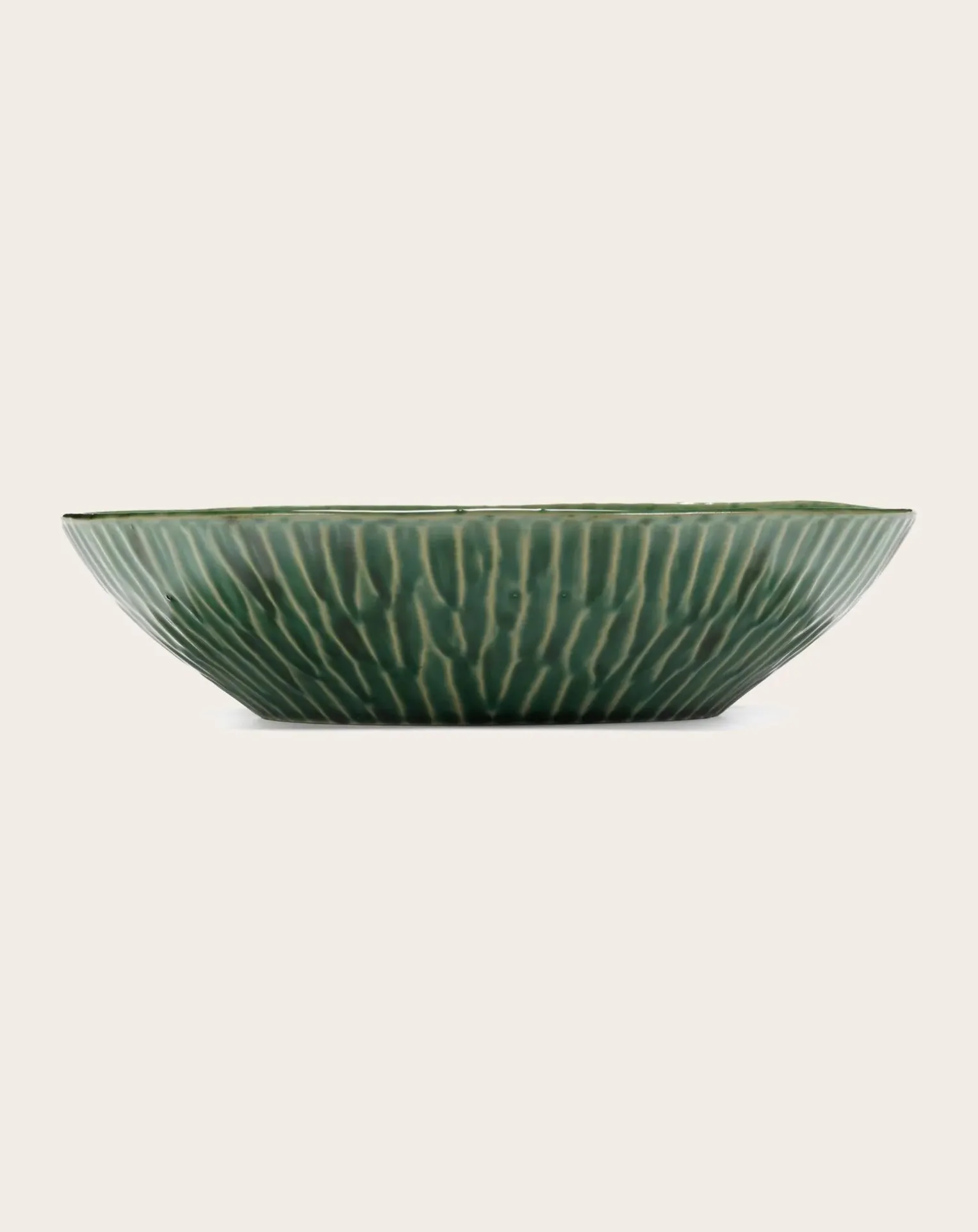 - Pour son dernier livre « Eén Pan », Naessens n’a pas seulement pris la plume, elle est aussi retournée dans son atelier de céramique. Elle a personnellement créé la collection « Verde Lanza », désormais produite en exclusivité par Serax. Le nom fait référence à l’île de Lanzarote, où Naessens réside souvent. Elle s’y est inspirée du vert des fenêtres et des portes en bois, ainsi que des rares plantes qui se détachent sur le paysage lunaire noir. Le vert délavé par le soleil – une teinte qui se marie à merveille avec tout ce qui est délicieux – est rehaussé par la texture en forme de coquillage que Naessens a appliquée avec ses doigts. En bref : cent pour cent Pascale et autant de soleil.