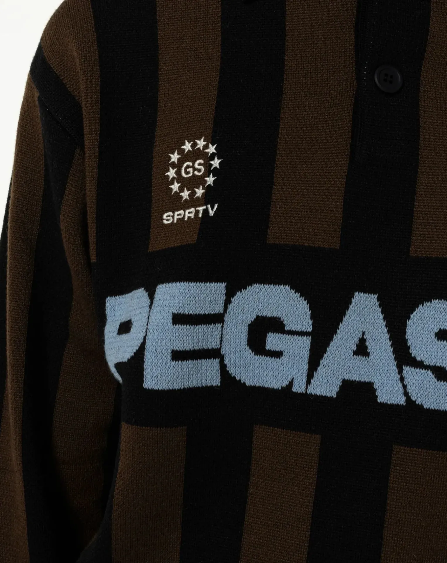 - Pull en maille fabriqué au Portugal. Col côtelé blanc, deux broderies blanches et imprimé Pegasus bleu.