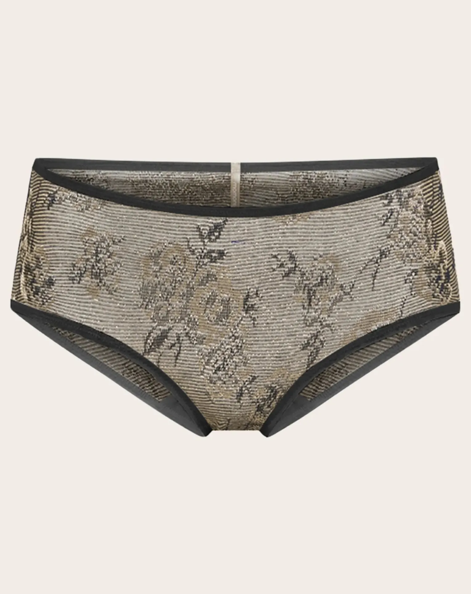 - Slip taille haute modèle « culotte » en jersey jaquard lurex stretch, fini avec bord élastique en contraste de couleur. Made in Italy.