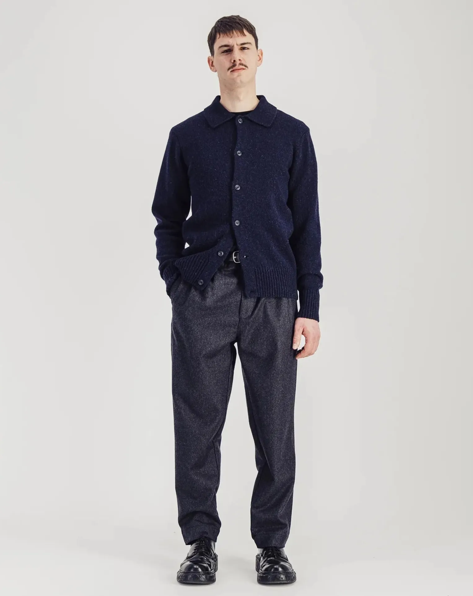 - Cardigan boutonné tricoté en laine shetland avec un col polo et des bords-côtes hauts aux poignets et au bas. La laine est filée, cardée et traitée en France.