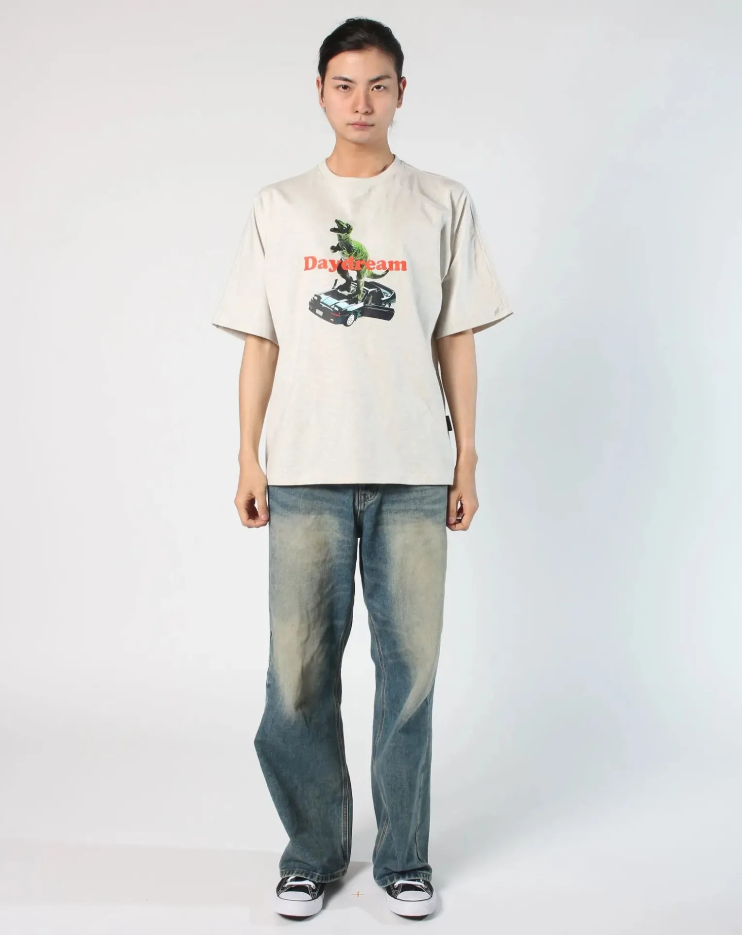 - T-Shirt unisexe coupe décontractée avec manches kimono, étiquette tissée sur le bas gauche et bande de propreté intérieure. Conçu et fabriqué à Séoul, Corée.