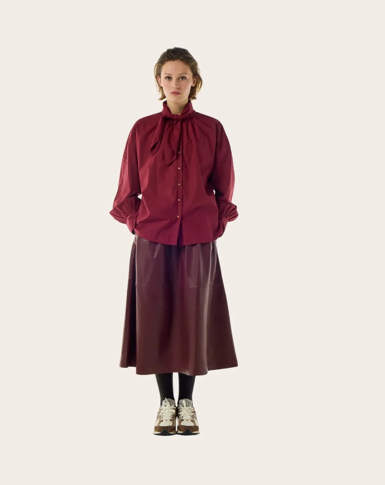 - « – Blouse en popeline uni- Coupe oversize- Manches longues- Col à nouer- Boutonnage tout du long